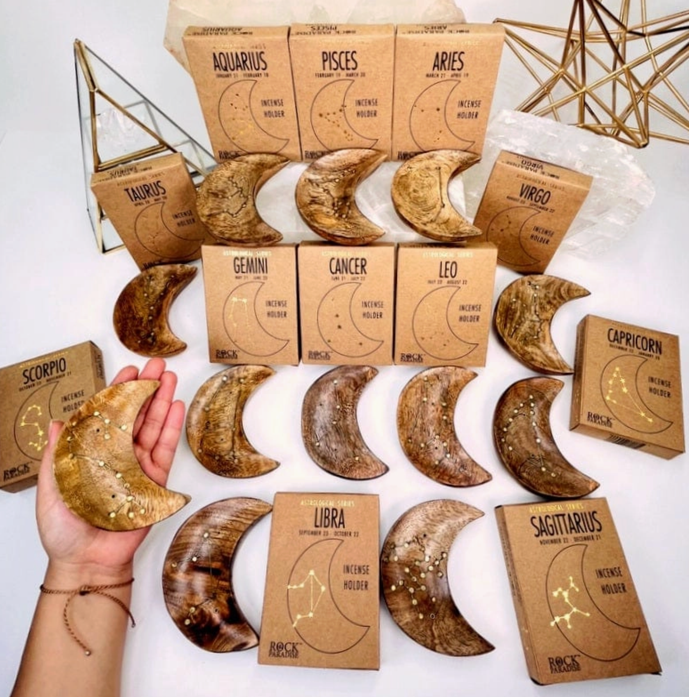 Moon crescent incense holders! These are made out of mango wood enhanced with a brass inlay constellation design, specially made for each zodiac sign!